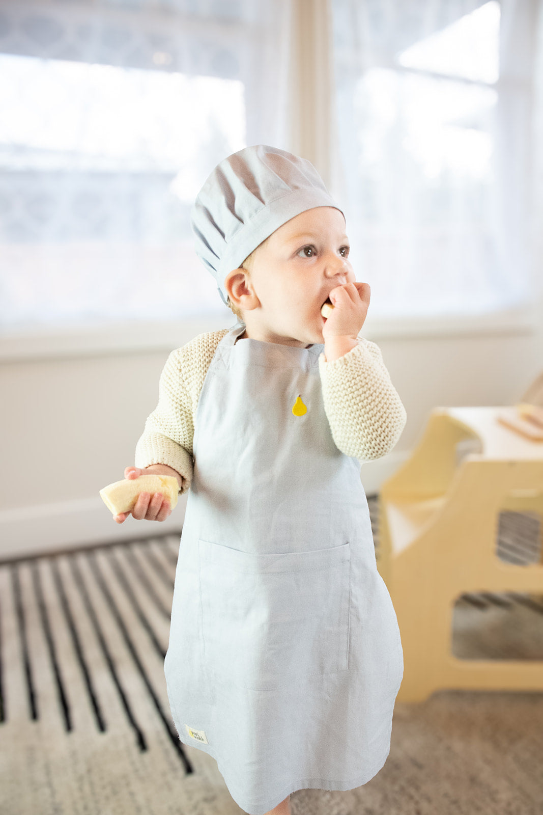 Is your toddler now wanting to join you in all the little task around the house? The Peariwinkle Little Chef Set is a must have essential for any Little Helper. With all the new exciting sensory activities your little one will engage in, the apron set ties at neck and waist, and has a large front pocket for easy-access storage along with an adorable hat that is adjustable for their growing selves. Made sustainably with organic cotton and linen.