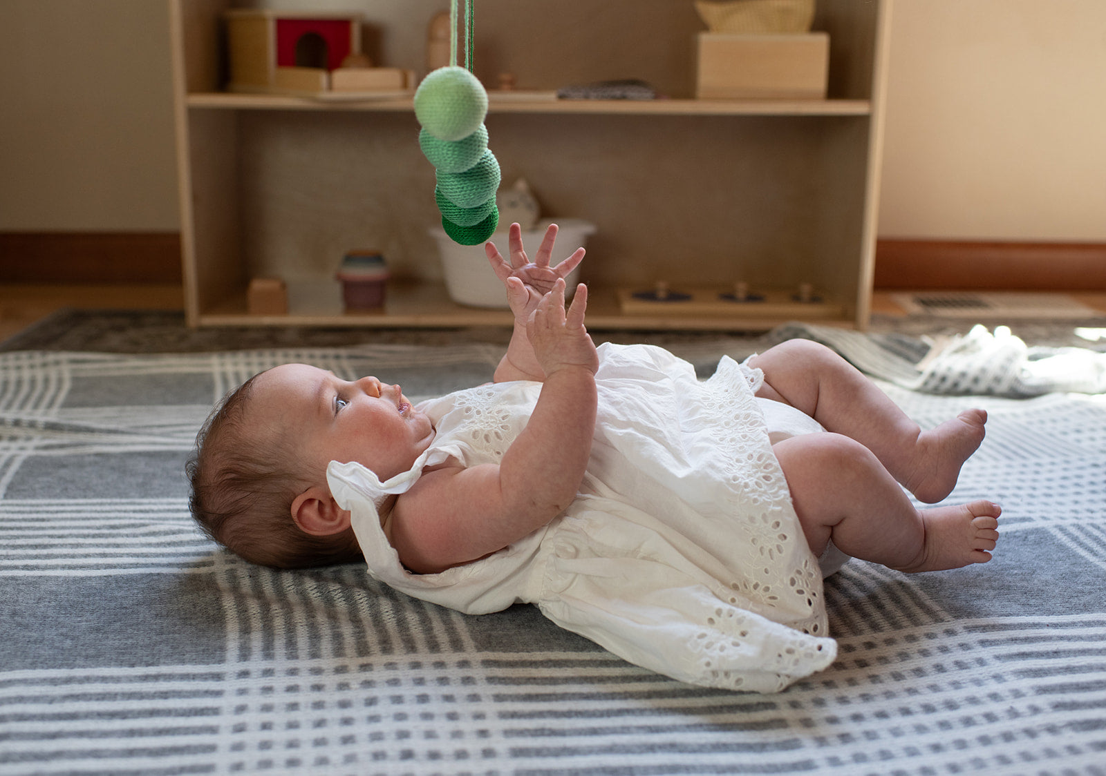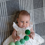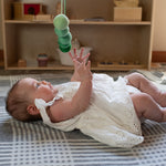 The Gobbi Mobile supports early visual development by helping babies explore depth perception, contrast, and subtle color variation. Five handcrafted spheres graduate from light to dark, encouraging your baby to track movement, focus their gaze, and begin understanding distance—all while remaining calm and engaged.